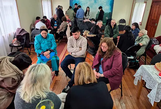CHILE. Orando en grupos el 3 de agosto en la Iglesia Bautista Nacional, Lanco, provincia de Valdivia.